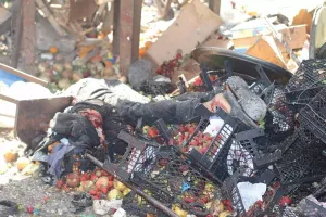يبدو المشهد أشد قسوة ما كلمات مبعثرة كما هي الأجساد التي تبعثرت فوق الخضار و اندمجت بها، وسط أصوات الباعة (الساسة) الهدنة لا تخرقوها، لا تلمسوها، لا تعطلوا على العابثين لعبهم ، فهم يمارسون حقهم و يأخذون مستحقاتهم من أرواحكم و دمائكم.