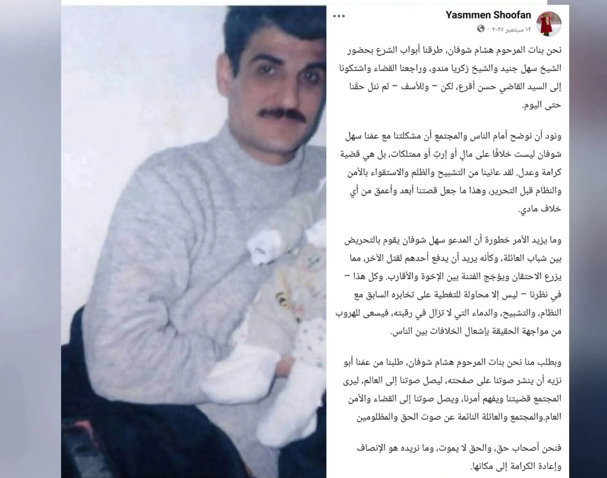 وفي منشورها، أكدت ياسمين أن العائلة طرقت أبواب القضاء والوجهاء مطالبة بالإنصاف، لكنها لم تصل إلى نتيجة، ما دفعها إلى إيصال صوتها للرأي العام، مشددة على أن "الحق لا يموت" وأن مطلبهم الأساسي هو استعادة الكرامة وإنصاف المظلومين.