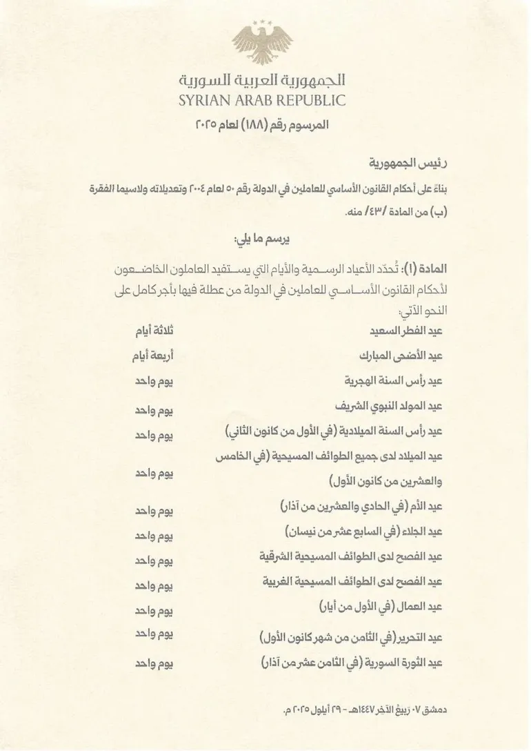 وأشار المرسوم إلى أن الجهات التي تتطلب طبيعة أعمالها الاستمرار في العمل خلال الأعياد يمكن أن تُستثنى من الالتزام بها وفق المادة (2) منه، مع السماح بتحديد تواريخ بعض الأعياد الدينية المتغيرة لاحقاً ببلاغات رسمية.