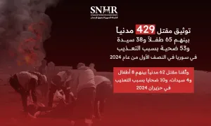 قالت "الشَّبكة السورية لحقوق الإنسان" في تقريرها الصادر اليوم إنَّ 429 مدنياً قد قتلوا في سوريا في النصف الأول من عام 2024، بينهم 65 طفلاً و38 سيدة، و53 شخصاً بسبب التعذيب، كما وثَّقنا مقتل 62 مدنياً في حزيران 2024، بينهم 8 أطفال و4 سيدات و10 ضحايا بسبب التعذيب.