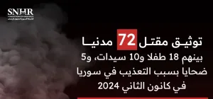 قالت "الشبكة السورية لحقوق الإنسان"، في تقريرها الصادر اليوم، إنَّ 72 مدنياً قد قتلوا في سوريا في كانون الثاني 2024 بينهم 18 طفلاً و10 سيدات و5 أشخاص بسبب التعذيب، ولفتت إلى مسؤولية القوات الأردنية عن ارتكاب مجزرة بحق 7 مدنيين بينهم 2 طفل و3 سيدات في ريف السويداء.