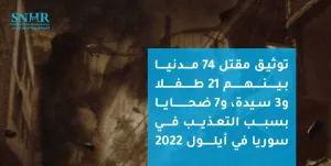 قالت "الشبكة السورية لحقوق الإنسان" في تقريرها الصادر اليوم، إنَّ 74 مدنياً قد قتلوا في سوريا في أيلول 2022 بينهم 21 طفلاً و3 سيدة، و7 ضحايا بسبب التعذيب، مؤكدةً أنَّ انتهاكات النظام السوري الفظيعة هي السبب الرئيس وراء دفع السوريين نحو الهجرة الغير نظامية وخطر الغرق والموت.