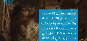 قالت "الشبكة السورية لحقوق الإنسان"، في تقريرها الصادر اليوم، إنَّ 91 مدنياً قد قتلوا في سوريا في آب 2022 بينهم 28 طفلاً و2 سيدة، و7 ضحايا بسبب التعذيب، مشيرةً إلى استمرار النظام السوري في قتل المواطنين السوريين ودون تسجيلهم متوفين ضمن دوائر السجل المدني.