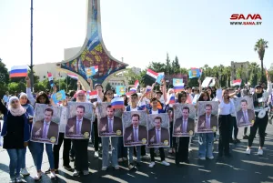 وقالت وكالة أنباء النظام "سانا"، إن تم رفع علم كبير لروسيا وعشرات الأعلام السورية والروسية، بالإضافة إلى مسيرة بالدراجات النارية، ما دفع سكان في مناطق سيطرة النظام بالسؤال عن مصدر المحروقات للدراجات فيما أطلق آخرون تساؤلات عن موعد الاحتفال بعلم الصين وإيران.