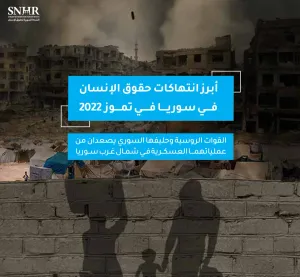 أصدرت "الشبكة السورية لحقوق الإنسان" اليوم تقريرها الشهري الخاص الذي يرصد حالة حقوق الإنسان في سوريا، واستعرضت فيه حصيلة أبرز انتهاكات حقوق الإنسان على يد أطراف النزاع والقوى المسيطرة في سوريا في تموز 2022، وأشارت إلى أنَّ القوات الروسية وحليفها السوري يصعدان من عملياتهما العسكرية في شمال غرب سوريا.