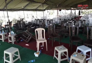 تخبط إعلام النظام الرسمي حول مصدر ونوع قصف قال إنه طال احتفالاً دينياً بمناسبة افتتاح "كنيسة آية صوفيا"، في مدينة السقيلبية بريف محافظة حماة وسط سوريا، حيث قالت وسائل إعلام تابعة لنظام الأسد إن صاروخاً استهدف المكان وأخرى ذكرت أن القصف نُفذ عبر طيران مسير، وفق تعبيرها.