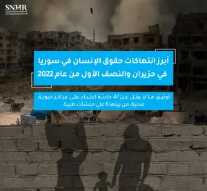 أصدرت "الشبكة السورية لحقوق الإنسان"، تقريرها الشهري الخاص الذي يرصد حالة حقوق الإنسان في سوريا، واستعرضت فيه حصيلة أبرز انتهاكات حقوق الإنسان على يد أطراف النزاع والقوى المسيطرة في سوريا في حزيران والنصف الأول من عام 2022، وأشارت إلى توثيق ما لا يقل عن 47 حادثة اعتداء على مراكز حيويَّة مدنيَّة، من بينها 6 على منشآت طبية.