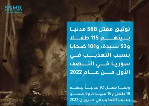 جاء في التقرير أنَّ من بين الضحايا 5 من الكوادر الطبية قتلوا في النصف الأول من عام 2022 على يد جهات أخرى. ووفقَ التقرير فقد وثَّق فريق العمل في الشبكة السورية لحقوق الإنسان في النصف الأول من عام 2022 مقتل 101 شخصاً بسبب التعذيب بينهم 1 سيدة، 90 منهم على يد قوات النظام السوري بينهم 1 سيدة، و1 على يد هيئة تحرير الشام، و1 على يد جميع فصائل المعارضة المسلحة/ الجيش الوطني، و9 على يد قوات سوريا الديمقراطية. وبحسب التقرير فقد تم توثيق مقتل 6 شخصاً بسبب التعذيب في حزيران.