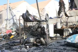 وقال الدفاع المدني إن سبب الحريق يعود لانفجار بطارية داخل الخيمة، والذي تمدد ليؤدي لاحتراق خيمةٍ أخرى بالجوار.