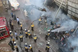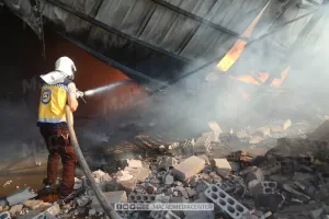 وبعد أقل من ساعة من الاستهداف الأول، عاودت قوات النظام وروسيا قصف المنطقة من جديد، ما أدى لإصابة 10 مدنيين، واندلاع حرائق كبيرة في منشآت صناعية في المنطقة.