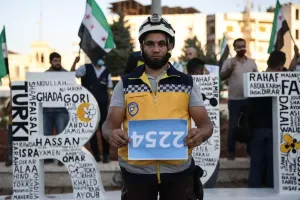 شارك متطوعون من "الخوذ البيضاء" وناشطون بوقفة احتجاجية، في الذكرى الثامنة لمجزرة كيماوي الغوطة، أمام مجسم TRUTH في مدينة إدلب، في وقت تم تنكيس علم الدفاع المدني السوري، و رفع راية "لا تخنقوا الحقيقة".