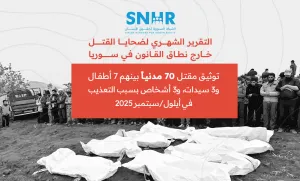 قالت الشَّبكة السورية لحقوق الإنسان في تقريرها الصادر اليوم إنَّ 70 مدنياً قد قتلوا في سوريا في أيلول/ سبتمبر 2025، بينهم 7 أطفال و3 سيدات، و3 بسبب التعذيب.