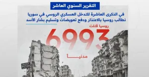أصدرت الشَّبكة السورية لحقوق الإنسان اليوم تقريراً بمناسبة الذكرى العاشرة للتدخل العسكري الروسي في سوريا، طالبت فيه روسيا بتقديم اعتذارٍ رسمي، ودفع تعويضاتٍ للضحايا، وتسليم بشار الأسد الذي فرَّ إلى روسيا بعد سقوط نظامه في كانون الأول/ديسمبر 2024. وقد وثَّقت الشَّبكة مقتل 6993 مدنياً، بينهم 2061 طفلاً و984 سيدة.