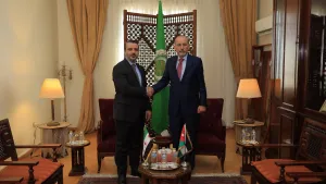 أكد نائب رئيس الوزراء ووزير الخارجية وشؤون المغتربين الأردني أيمن الصفدي، دعم المملكة المطلق لسوريا وأمنها واستقرارها وسيادتها، خلال مباحثات ثنائية جمعته بوزير الخارجية والمغتربين السوري أسعد الشيباني، على هامش أعمال الدورة العادية الـ164 لمجلس جامعة الدول العربية على المستوى الوزاري في القاهرة.