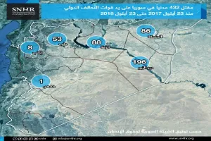ووثَّق التقرير مقتل 2832 مدنياً، بينهم 861 طفلاً، و617 سيدة (أنثى بالغة) على يد قوات التَّحالف الدولي منذ تدخلها العسكري في سوريا حتى 23/ أيلول/ 2018، و أورد توزعاً لحصيلة الضحايا على الأعوام حيث شهدَ العامان الثالت والرابع العدد الأكبر من الضحايا، كما أشار التَّقرير إلى توزُّع حصيلة الضحايا بحسب المحافظات، حيث سقط العدد الأكبر من الضحايا في محافظة الرقة تلتها محافظتي حلب ودير الزور.