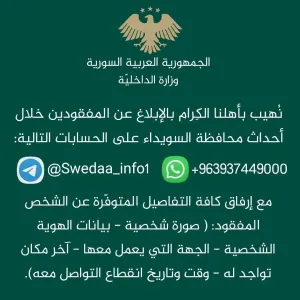 دعت وزارة الداخلية السورية أهالي محافظة السويداء إلى الإبلاغ عن حالات الفقدان التي وقعت خلال الأحداث الأخيرة، وذلك في إطار المتابعة الحثيثة لكشف مصير المفقودين وتقديم الدعم اللازم لعائلاتهم.