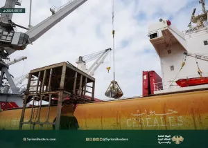 في إطار خطة الحكومة السورية لتعزيز الأمن الغذائي والمخزون الاستراتيجي من مادة القمح، تتواصل في مرفأ اللاذقية أعمال تفريغ باخرة محمّلة بـ30 ألف طن من القمح، جرى توريدها لصالح المؤسسة العامة للحبوب.