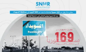 وثّقت الشبكة السورية لحقوق الإنسان مقتل ما لا يقل عن 169 شخصًا في محافظة السويداء، بينهم 5 أطفال و6 نساء، إلى جانب إصابة أكثر من 200 مدني بجروح متفاوتة الخطورة، وذلك خلال الفترة الممتدة من 13 تموز/يوليو 2025 وحتى تاريخ إصدار التقرير. وأكدت الشبكة أن هذه الأرقام تم التحقق منها ميدانيًا وتشكل حصيلة أولية قابلة للتحديث.