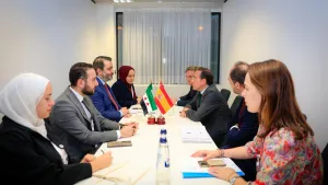 والتقى الوزير الشيباني نظيره الأردني أيمن الصفدي، حيث تناول اللقاء العلاقات الثنائية وسبل تعزيز التعاون بين البلدين في مختلف المجالات. كما اجتمع مع وزير الخارجية الإسباني خوسيه مانويل ألباريس، وبحث الجانبان تعزيز التعاون بين الجمهورية العربية السورية ومملكة إسبانيا في مجالات متعددة ذات اهتمام مشترك.