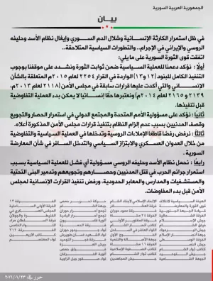 أكد 47 فصيلا ثوريا إلى جانب الهيئة السياسية للائتلاف الوطني السوري على دعمهم للعملية السياسية ضمن ثوابت الثورة مشددين على ضرورة تنفيذ البندين 12 و 13 الواردين في قرار مجلس الأمن رقم 2254 لعام 2015 والذان ينصان على وقف استهداف المدنيين وفك الحصار وإطلاق سراح المعتقلين مشيرين إلى أنه لايمكن البدء بأي عملية سياسية قبل تنفيذهما.