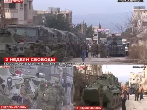 ومن اللقاءات التي أجرتها المحطات الروسية ، التي اعتبرت احتلال سلمى نصراً لروسيا ، لقاءات مع سوريون يتكلمون لغة روسية فيما يبدو أنهم يعملون كمترجمين .