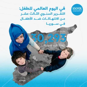 أصدرت "الشَّبكة السورية لحقوق الإنسان" اليوم تقريرها السنوي الثالث عشر عن الانتهاكات ضد الأطفال في سوريا، وذلك بمناسبة "اليوم العالمي للطفل"، سلَّط التقرير الضوء على مقتل ما لا يقل عن 30,293 طفلاً منذ آذار/مارس 2011، منهم 225 طفلاً قضوا جراء التعذيب، بينما لا يزال 5,298 طفلاً قيد الاعتقال أو الاختفاء القسري.