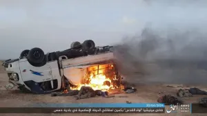 وحسب وكالة أنباء التنظيم، "أعماق"، فإنّ 20 قتيلا على الأقل سقطوا بهجوم للتنظيم، ونقلت عن مصادر عسكرية قولها: أن مقاتلي الدولة نصبوا كمينا محكما، لآلية محملة بعناصر ميليشيا لواء القدس كانت تسير على طريق بادية السخنة بريف حمص الشرقي.