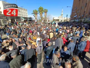 ويواصل المحتجون رفع شعارات التغيير السياسي، استنادا إلى القرار 2254، في ظل تفاعل واسع مع استمرار تلك الاحتجاجات من مختلف أطياف الفعاليات في المنطقة، والتفاف المشيخة الدرزية حول المحتجين وتوجيههم.