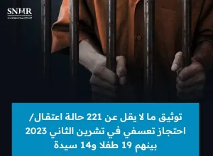 قالت "الشبكة السورية لحقوق الإنسان" في تقريرها الصادر اليوم، إنَّ ما لا يقل عن 221 حالة اعتقال/ احتجاز تعسفي بينهم 19 طفلاً و14 سيدة، قد تمَّ توثيقها في تشرين الثاني 2023، وأشارت إلى أنَّ الشبكة السورية لحقوق الإنسان تمكنت من رفع حصيلة المعتقلين والمختفين قسرياً في سوريا في قرار الجمعية العامة للأمم المتحدة الصادر في 15/ تشرين الثاني/ 2023 إلى 135 ألفاً.