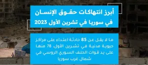 أصدرت "الشبكة السورية لحقوق الإنسان" اليوم، تقريرها الشهري الخاص الذي يرصد حالة حقوق الإنسان في سوريا، واستعرضت فيه حصيلة أبرز انتهاكات حقوق الإنسان على يد أطراف النزاع والقوى المسيطرة في سوريا في تشرين الأول 2023، وأشارت إلى وقوع ما لا يقل عن 85 حادثة اعتداء على مراكز حيوية مدنية، 78 منها على يد قوات الحلف السوري الروسي في شمال غرب سوريا.