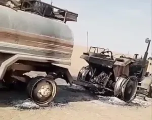 وبث الناشط الميداني "أحمد الشبلي"، مقطعاً مصوراً يظهر موقع الهجوم واحتراق المركبات المدنية، نتيجة هجوم شنته مليشيات نظام الأسد وإيران في شرقي محافظة حماة، قرب الحدود الإدارية مع محافظة الرقة، شرقي سوريا.