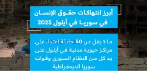أصدرت "الشبكة السورية لحقوق الإنسان" اليوم تقريرها الشهري الخاص الذي يرصد حالة حقوق الإنسان في سوريا، واستعرضت فيه حصيلة أبرز انتهاكات حقوق الإنسان على يد أطراف النزاع والقوى المسيطرة في سوريا في أيلول 2023، وأشارت إلى وقوع ما لا يقل عن 50 حادثة اعتداء على مراكز حيوية مدنية في أيلول على يد كل من النظام السوري وقوات سوريا الديمقراطية.