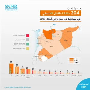 سجَّل التقرير في أيلول ما لا يقل عن 204 حالة اعتقال تعسفي/ احتجاز بينها 12 طفلاً و6 سيدات (أنثى بالغة)، وقد تحوَّل 161 منها إلى حالات اختفاء قسري. كانت 84 منها على يد قوات النظام السوري، بينهم 5 أطفال و3 سيدات، و72 بينهم 6 أطفال و1 سيدة على يد قوات سوريا الديمقراطية. فيما سجَّل التقرير 14 حالة على يد هيئة تحرير الشام، و34 حالة على يد جميع فصائل المعارضة المسلحة/ الجيش الوطني بينهم 1 طفل، و2 سيدة.