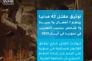 قالت "الشبكة السورية لحقوق الإنسان" في تقريرها الصادر اليوم، إنَّ 42 مدنياً قد قتلوا في سوريا في أيار 2023 بينهم 7 أطفال و1 سيدة و1 شخص بسبب التعذيب، ولفتت إلى أنَّ حوادث القتل خارج نطاق القانون مستمرة في سوريا على الرغم من إعادة النظام السوري إلى الجامعة العربية.