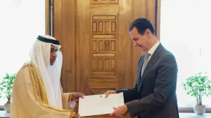 ونشر حساب سفارة الإمارات في دمشق، على "تويتر"، أن الأسد استقبل يوم الأحد القائم بأعمال سفارة دولة الإمارات في دمشق، بشار السيد عبدالحكيم النعيمي، الذي قام بتسليمه الدعوة الموجهة من رئيس دولة الإمارات العربية المتحدة لحضور مؤتمر الأطراف للمناخ (COP28) الذي سيقام في مدينة دبي ما بين 30 نوفمبر لغاية 12 ديسمبر.
