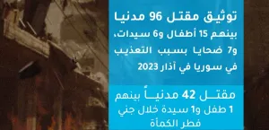 قالت "الشبكة السورية لحقوق الإنسان"، في تقريرها الصادر اليوم، إنَّ 96 مدنياً قد قتلوا في سوريا في آذار 2023 بينهم 15 طفلاً و6 سيدات، و7 ضحايا بسبب التعذيب، ولفتت إلى مقتل 42 مدنياً بينهم 1 طفل و1 سيدة خلال جني فطر الكمأة.