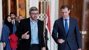 وضم الوفد رئيس الاتحاد محمد الحلبوسي ورؤساء مجلس النواب في الإمارات العربية المتحدة والأردن وفلسطين وليبيا ومصر، إضافة إلى رؤساء وفدي سلطنة عمان ولبنان، والأمين العام للاتحاد البرلماني العربي، شملت زيارتهم لقاء الإرهابي "بشار الأسد".