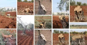 ونشرت عشرات الصور والفيديوهات التي تظهر عمليات القطع الجائر لأشجار الزيتون من الحقول الزراعية بريف عفرين، رغم وجود أصحابها سواء من المكون العربي أو الكردي، من قبل عناصر الفصائل دون أي رادع.