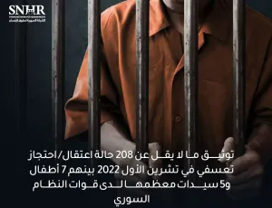 سجَّل التقرير في تشرين الأول ما لا يقل عن 208 حالة اعتقال تعسفي/ احتجاز بينها 7 أطفال و5 سيدات، وقد تحوَّل 124 منها إلى حالات اختفاء قسري. كانت 86 منها على يد قوات النظام السوري، و46 بينهم 7 أطفال على يد قوات سوريا الديمقراطية. فيما سجَّل التقرير 27 بينهم 1 سيدة على يد جميع فصائل المعارضة المسلحة/ الجيش الوطني، و49 على يد هيئة تحرير الشام.