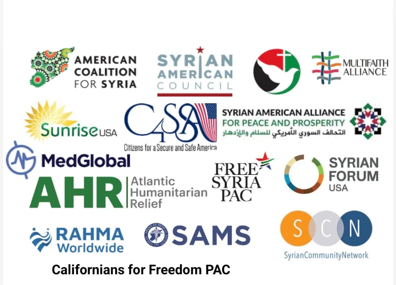 المنظمات الموقّعة تشمل: المجلس السوري الأميركي، مواطنون من أجل أميركا آمنة، تحالف السوريين الأميركيين من أجل السلام والازدهار، الجمعية السورية الأميركية للأطباء، ميدغلوبال، سوريون مسيحيون، التحالف الأميركي لأجل سوريا، منظمة الإغاثة الإنسانية الأطلسية، لجنة كاليفورنيون من أجل الحرية للعمل السياسي، لجنة سوريا الحرة للعمل السياسي، التحالف متعدد الأديان، رحمة حول العالم، منظمة شروق الشمس، شبكة المجتمع السوري، المنتدى السوري".