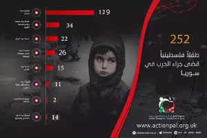 كشف فريق الرصد والتوثيق في "مجموعة العمل من أجل فلسطينيي سوريا"، عن توثيق قضاء (252) طفلاً فلسطينياً بسبب الحرب في سورية منذ عام 2011 وحتى يوم 20 نوفمبر 2020، وذلك بمناسبة اليوم العالمي للطفل.