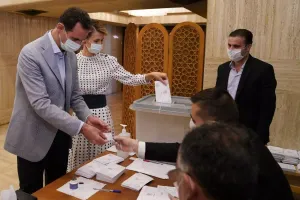 ونشرت وكالة أنباء النظام "سانا" صوراً لرأس النظام وزوجته وهما يقومان بالمشاركة بالتصويت في انتخابات "مجلس التصفيق" للدور التشريعي الثالث، وذلك في المركز الانتخابي بوزارة شؤون التابع للقصر الجمهوري بدمشق.