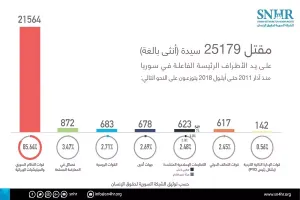 قدمت الشبكة السورية لحقوق الإنسان، إحصائية تتحدث عن مقتل "25179" امرأة في سوريا، منذ آذار 2011 حتى أيلول 2018، قتل النظام السوري أكثر من 85 % منهم، في وقت بلغ عدد المدنيين الذين قتلوا خلال ذات الفترة "222114" مدنياً أكثر من 89 % منهم.