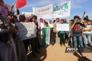 وحمل المحتجون لافتات وعبارات يطالبون بتحرير قرى وبلدات تل رفعت ومنغ وباقي القرى التي لاتزال تسيطر عليها المليشيات الانفصالية الكردية شمالي حلب، بعد توقف عملية "غصن الزيتون" على مشارف هذه القرى.