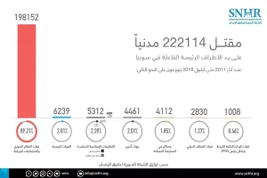 نشرت الشبكة السورية لحقوق الإنسان، شارتاً يوثق حصيلة الضحايا المدنيين الذين قُتلوا في سوريا منذ آذار 2011 حتى أيلول 2018، والتي بلغ عددهم "222114" مدنياً، قتل النظام السوري أكثر من 89 % منهم.