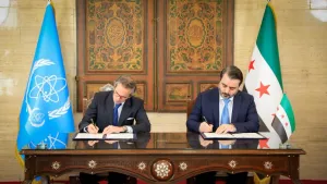 وجرى التوقيع في مقر الوكالة الدولية للطاقة الذرية، حيث وقّع المذكرة من الجانب السوري وزير الخارجية والمغتربين السيد أسعد حسن الشيباني، ومن جانب الوكالة المدير العام السيد رافائيل ماريانو جروسي.