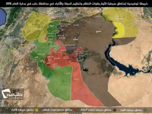 بعد بدء العام الجديد أعدت شبكة حلب نيوز خريطة توضيحية لمناطق سيطرة كافة الأطراف في محافظة حلب، حيث شهد العام المنصرم تمدد جديد لتنظيم الدولة في ريف حلب الشمالي، ويحاول تنظيم الدولة منذ عدة أشهر التقدم في الريف الشمالي بهدف التقدم والسيطرة على مدينة مارع الاستراتيجية، وبات في هذه الأيام على تخومها.