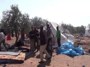 وقال الدفاع المدني إن القصف تسبب بتضرر عدد كبير من الخيم وتبعثر محتوياتها بالإضافة إلى احتراق أخرى .