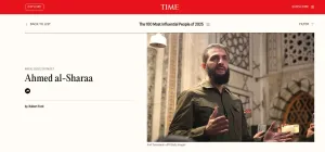 أدرجت مجلة "تايم" الأمريكية، الرئيس السوري "أحمد الشرع" ضمن قائمتها السنوية لأكثر الشخصيات تأثيراً في العالم لعام 2025، إلى جانب زعماء عالميين وشخصيات بارزة في مجالات السياسة والفكر والثقافة.