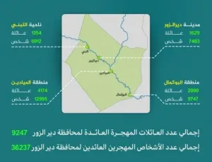 وأظهرت الإحصائية أن إجمالي عدد العائلات المهجّرة العائدة إلى دير الزور بلغ 9247 عائلة، بينما وصل عدد الأفراد العائدين إلى 36237 شخصاً، وبحسب تفاصيل الإحصائية، فقد سجلت مدينة دير الزور عودة 1629 عائلة، بما يعادل 7483 شخصاً، في حين شهدت منطقة البوكمال عودة 2090 عائلة تضم 9747 فرداً.